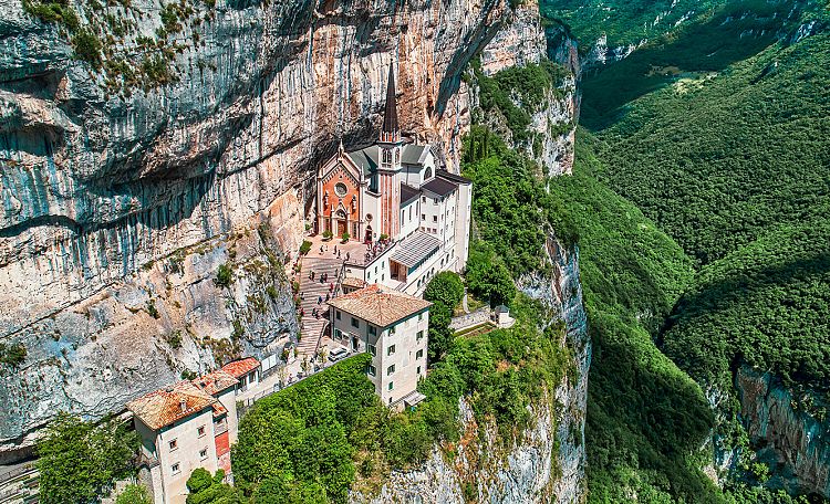 3 dzień: śniadanie; przejazd do Sanktuarium Madonna della Corona zawieszonego między niebem a ziemią na masywie Monte Baldo na wysokości 774 metrów n.p.m., wysoko ponad doliną Adygi. Jest jednym